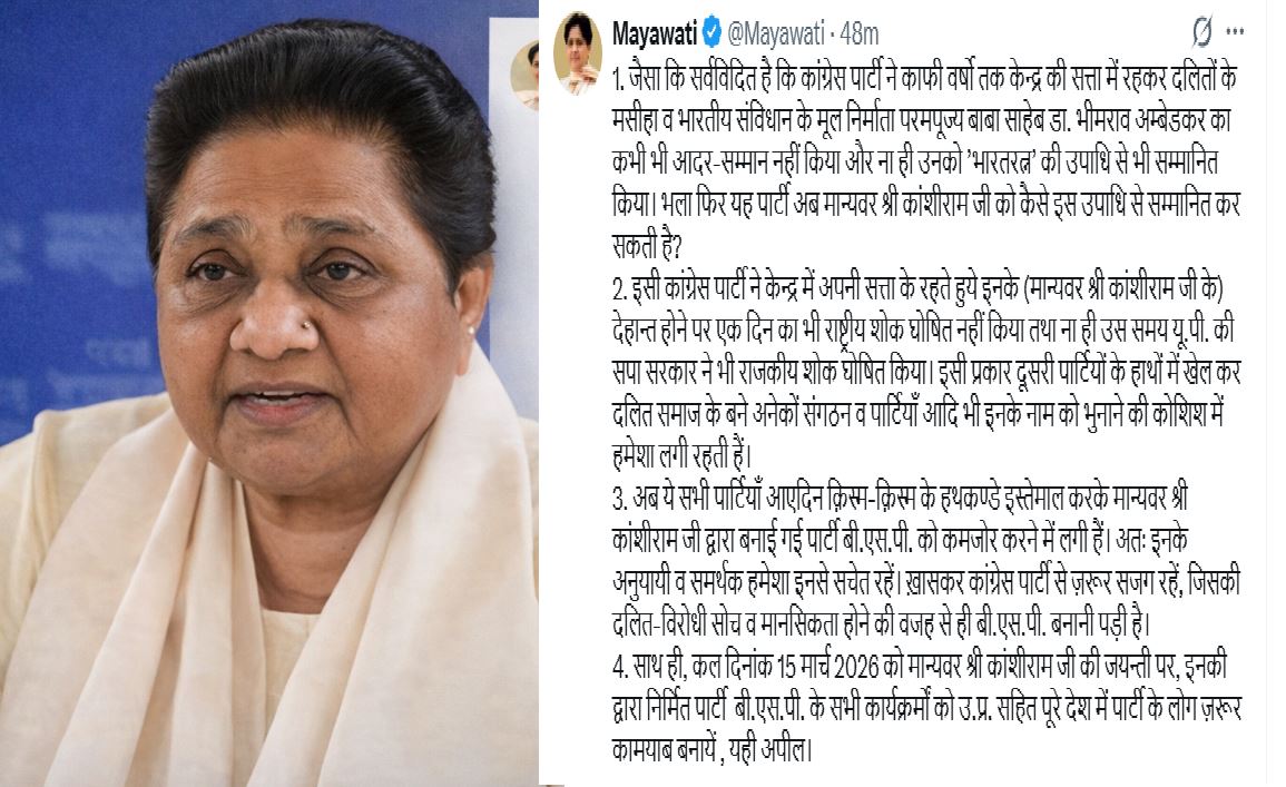 साथ ही उन्होंने आगे लिखा कि निधन पर राष्ट्रीय शोक घोषित नहीं किया था.ये सिर्फ नाम भुनाने की कोशिश करते हैं. सिर्फ BSP कमजोर करने की कोशिश करते हैं.
