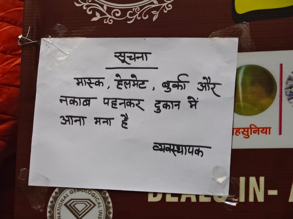 वाराणसी के आभूषण कारोबारियों ने अपने दुकानों के बाहर पोस्टर लगाए जाने के साथ ही बुर्का और नकाब शब्द लिखकर पोस्टर चस्पा किए जाने पर किसी को आपत्ति न किए जाने की अपील की। कारोबारियों का कहना कि बुर्का और नकाब पहनकर आने वाले ग्राहकों और किसी को भी अपनी पहचान बताने पर आपत्ति नहीं होनी चाहिए। आपत्ति वही लोग करेंगे जो अपराधी प्रवृति के हो, क्योंकि जो कुछ महीनों में अपराधिक घटनाओं की तस्वीरें सामने आए है, उनमें साफ दिख था है कि कोई बुर्का की आड़ में चोरी कर रहा है, तो कोई हेलमेट लगाकर अपराधिक घटनाओं को अंजाम दे रहा है। ऐसे में सुरक्षा की दृष्टि से सभी ग्राहक बुर्का, नकाब और मास्क के साथ हेलमेट को निकलकर ही आभूषण के दुकान में प्रवेश करें।